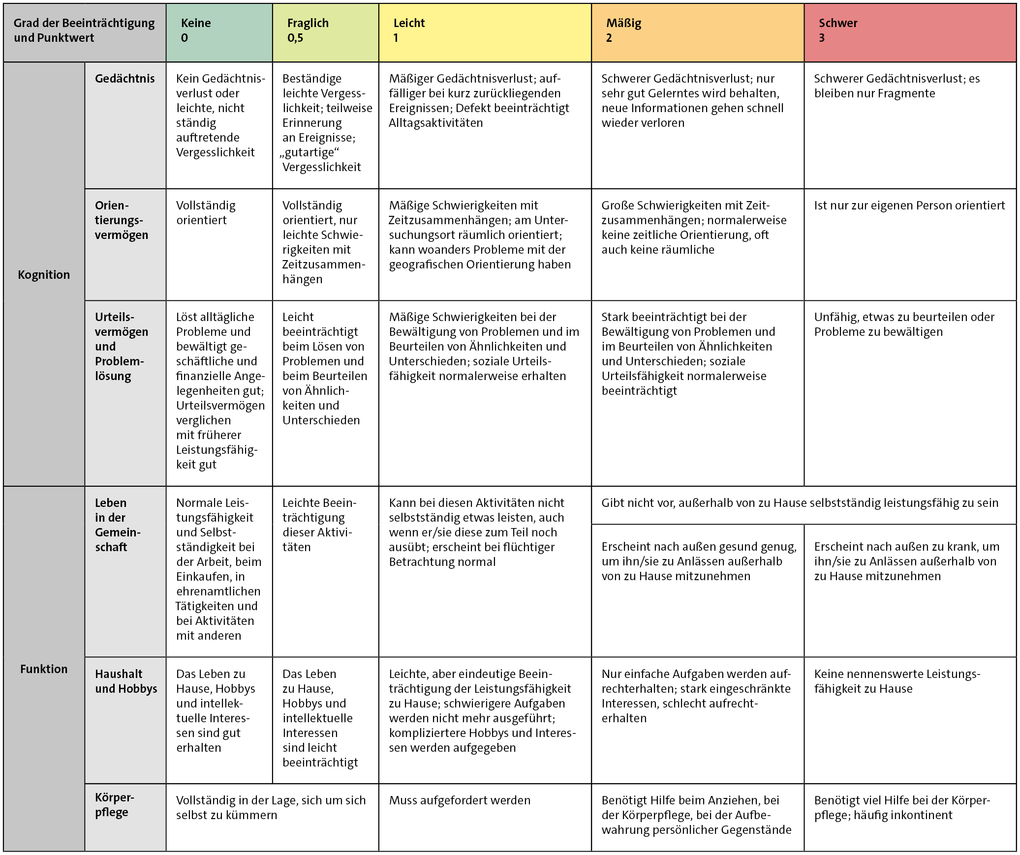 Um die Auswirkungen einer Alzheimer-Krankheit zu erfassen, beinhaltet der CDR-Fragebogen verschiedene Fragen zur Denk- und Gedächtnisleistung (Kognition) und wie man im Alltag zurechtkommt (Funktion).